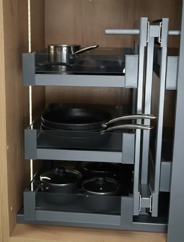 - Enhanced Accessibility: Traditional corner cabinets often lead to items being pushed to the back, making them hard to reach. The MAIA Magic Corner's pull-out mechanism brings all stored items forward, ensuring easy access without the need to bend or stretch.